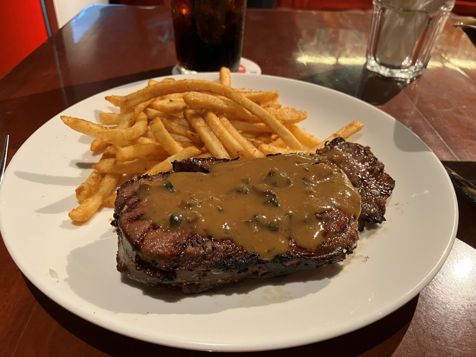 中華ばかりだと飽きるので、ラッフルズプレイスの川沿いにあるレストラン&バーでステーキを食べました。場所は、地下鉄のラッフルズプレイス駅から川沿いを進み、レストランが並んでいるところにあります。このレストランの通りを入ってからすぐに見つかります。