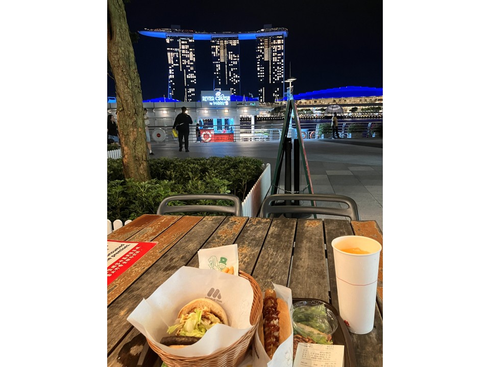 次に紹介するのが、マーライオン公園にある「モスバーガー」です。モスバーガー自体は日本でも食べられますが、ここには屋外にテラス席があり、そこからマリーナベイサンズを眺めながら、食事をすることができます。特に追加料金も発生しません。これは結構贅沢だなーと思いました。